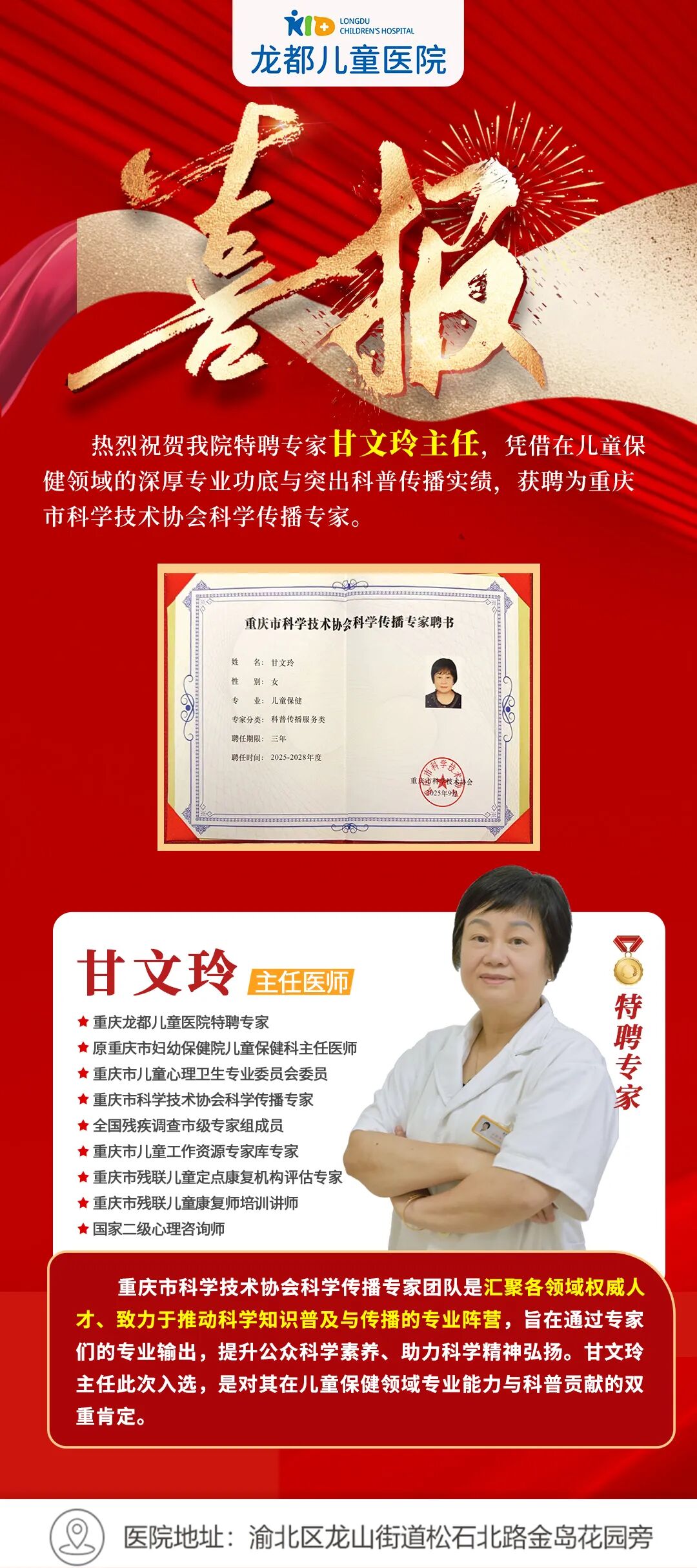 热烈祝贺我院特聘专家甘文玲主任,凭借在儿童保健领域的深厚专业功底与突出科普传播实绩,成功获聘为重庆市科学技术协会科学传播专家!